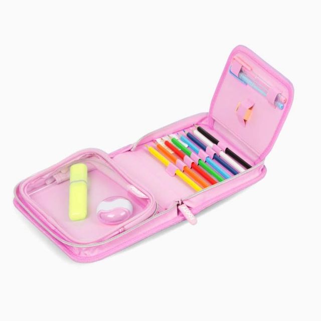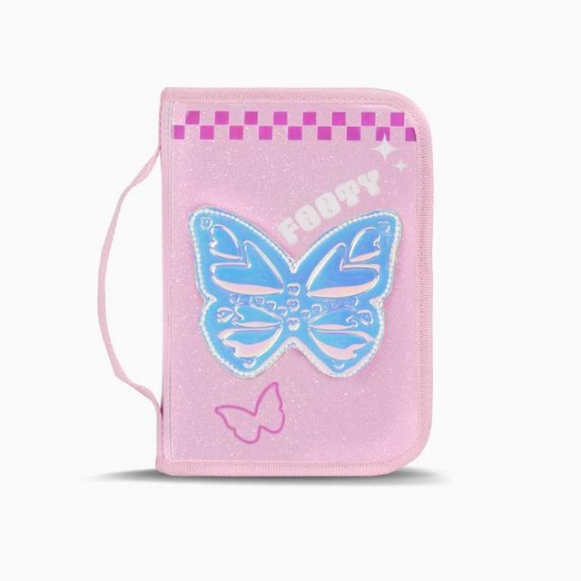 Cartuchera de 1 piso desplegable. Frente con glitter, pvc estampado y aplique de mariposa en holograma con relieve.