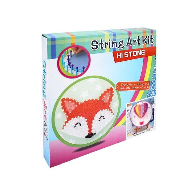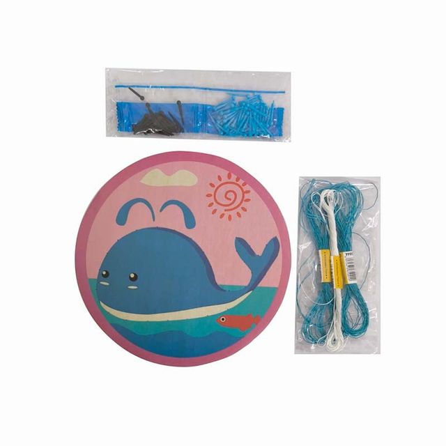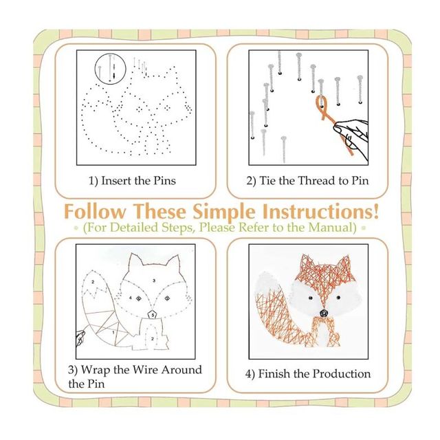 Cada caja contiene: un lienzo, alfileres plásticos (push pins) para delinear el contorno de la figura, hilos de colores para entrelazar entre los alfileres y la plantilla con el diseño para hacer de guía