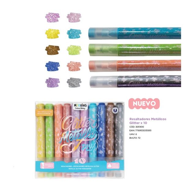 Consultar porMooving Coloring Resaltador x10 Glitter Metallic Plus (3051610)