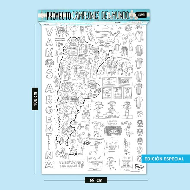 El Proyecto Campeones del Mundo es un mapa gigante para colorear que ilustra la historia de la Selección Argentina en los mundiales de fútbol. Un recorrido por los hitos que quedaron grabados en la memoria colectiva: finales, goleadores, estadios, jugadores legendarios y consagraciones. Invita a revivir la pasión a través de escenas, personajes, cantos, ídolos ¡y mucho más! ¡Para compartir entre hinchas de todas las generaciones!