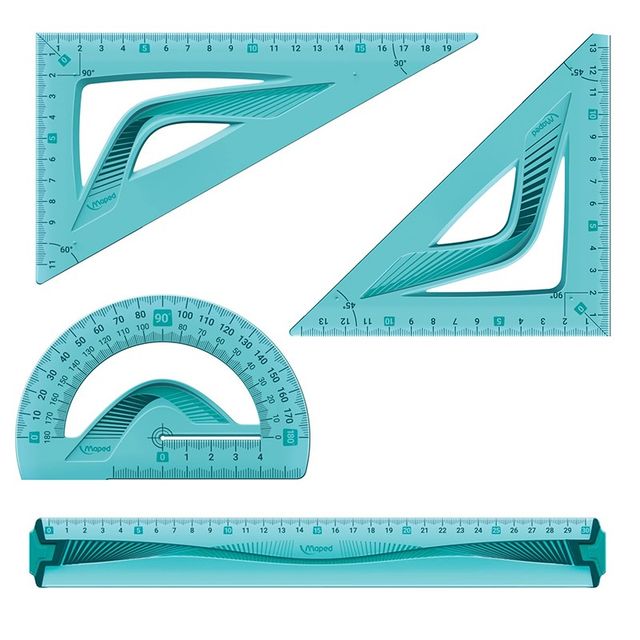 Maped - Kit de trazado de 4 piezas compuesto de: 1 regla 30 cm, 1 escuadra 60°/21 cm, 1 escuadra 45°/21 cm y 1 transportador 180°/12 cm.