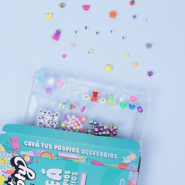 Un set lleno de accesorios divertidos y coloridos para crear todo lo que imagines. Con cuentas de diferentes formas y colores, puedes hacer pulseras, collares o cualquier proyecto creativo que se te ocurra. Es perfecto para dejar volar tu imaginación y convertir tus ideas en algo único y lleno de encanto.